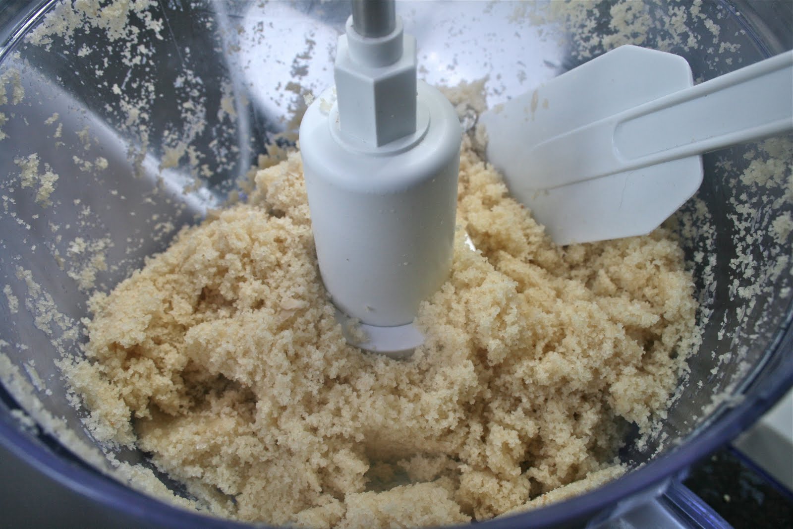 Blend the blanched almonds and apricot kernels, still wet from blanching, until they are very fine, almost a paste. You may need to do this a few times, scraping the sides of the food processor.