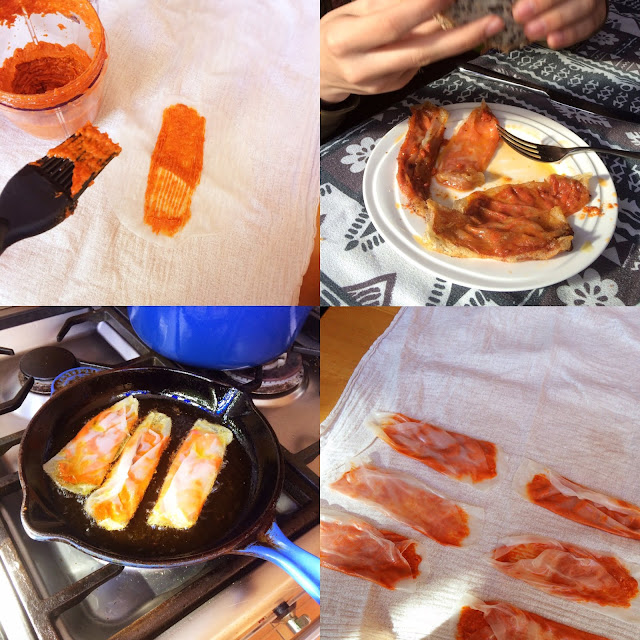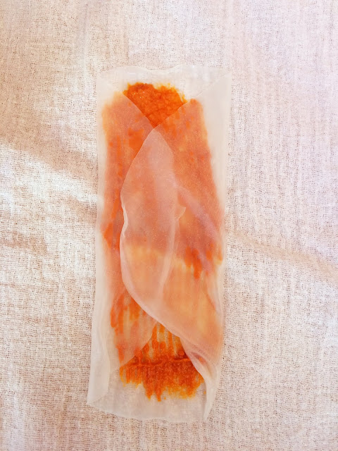 Soak the rice paper disks in hot water, just enough to soften them, and then place them on a clean gauze or kitchen towel. Brush the centre with the sun-dried tomato paste and then fold like shown in the photos.