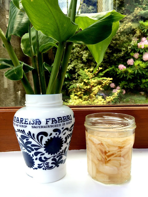 To make gari, the lovely pink pickled ginger for sushi, you need to have very fresh ginger roots, which are not to easy to find. So I grew my own! Bough ginger roots sometimes have a little green bud, or develop one if you leave them outside the fridge, and in this case you can just break a piece off (the one with the bud, of course) and plant it! I did just this, not knowing what to expect, and I was rewarded with a big leafy ginger plant! When I 'harvested' the roots they were fresh and fragrant, perfect for making gari.