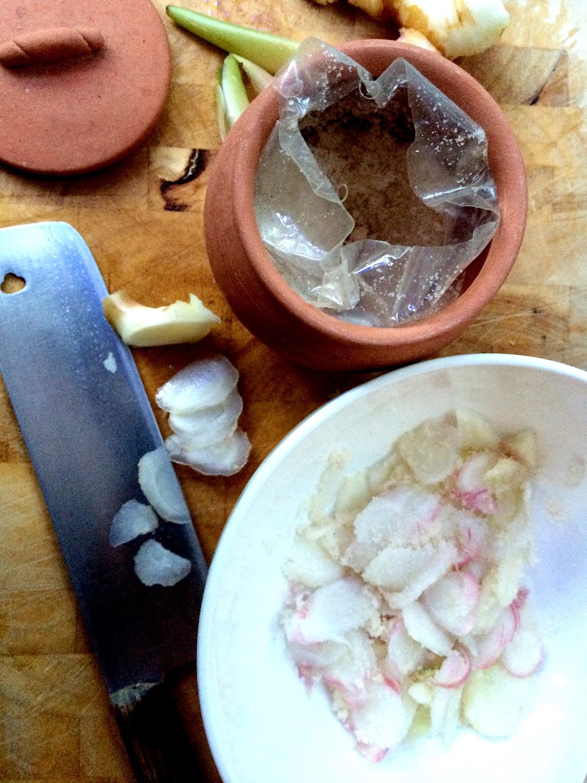 Then I added a few generous pinches of salt (I used some unrefined salt, but the book is not specific on which salt - or how much, to use) and left it stand for one day. I put a weight on top too, to make sure that the ginger got well pickled by the salt, but this was not requested by the original recipe.