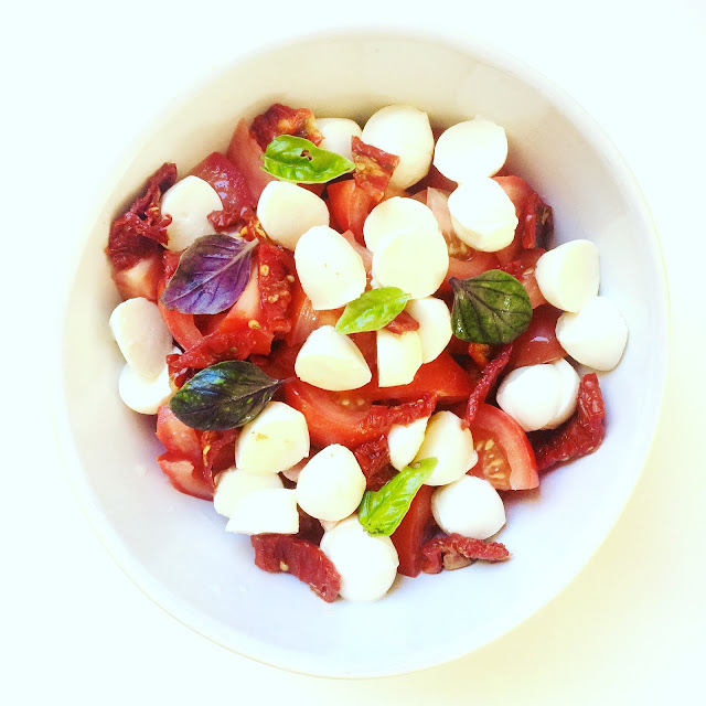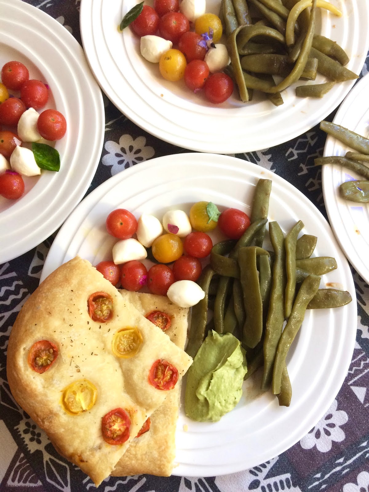 We had it for dinner with a Caprese salad (cherry tomatoes again, mozzarelline, basil and borage flowers) dressed with olive oil and salt, plus flat beans from the garden (teghe) boiled and dressed with balsamic vinegar, olive oil and salt (my daughter loves these!) and a simple guacamole (avocado, garlic, salt and lemon juice, made in the nutribullet!).