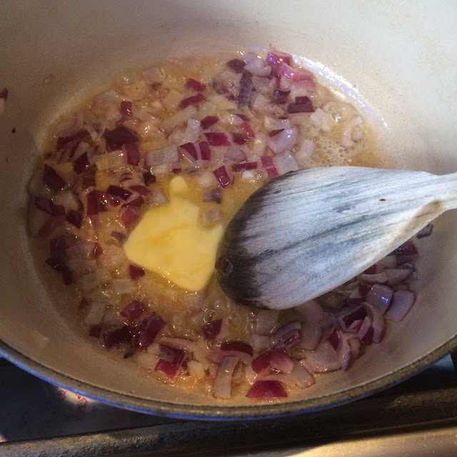 When the onion sizzle add the rice (I used arborio) and stir well: for a good risotto the fat at the beginning is important so make sure that the rice absorbs well the butter. Make really hot to the touch.