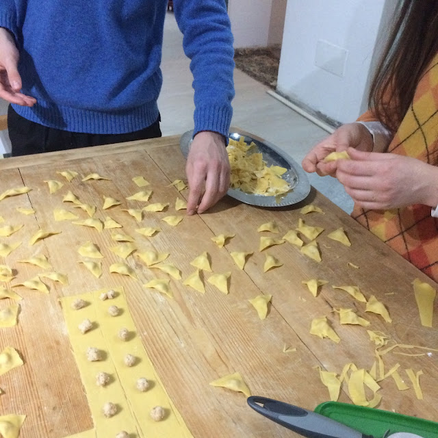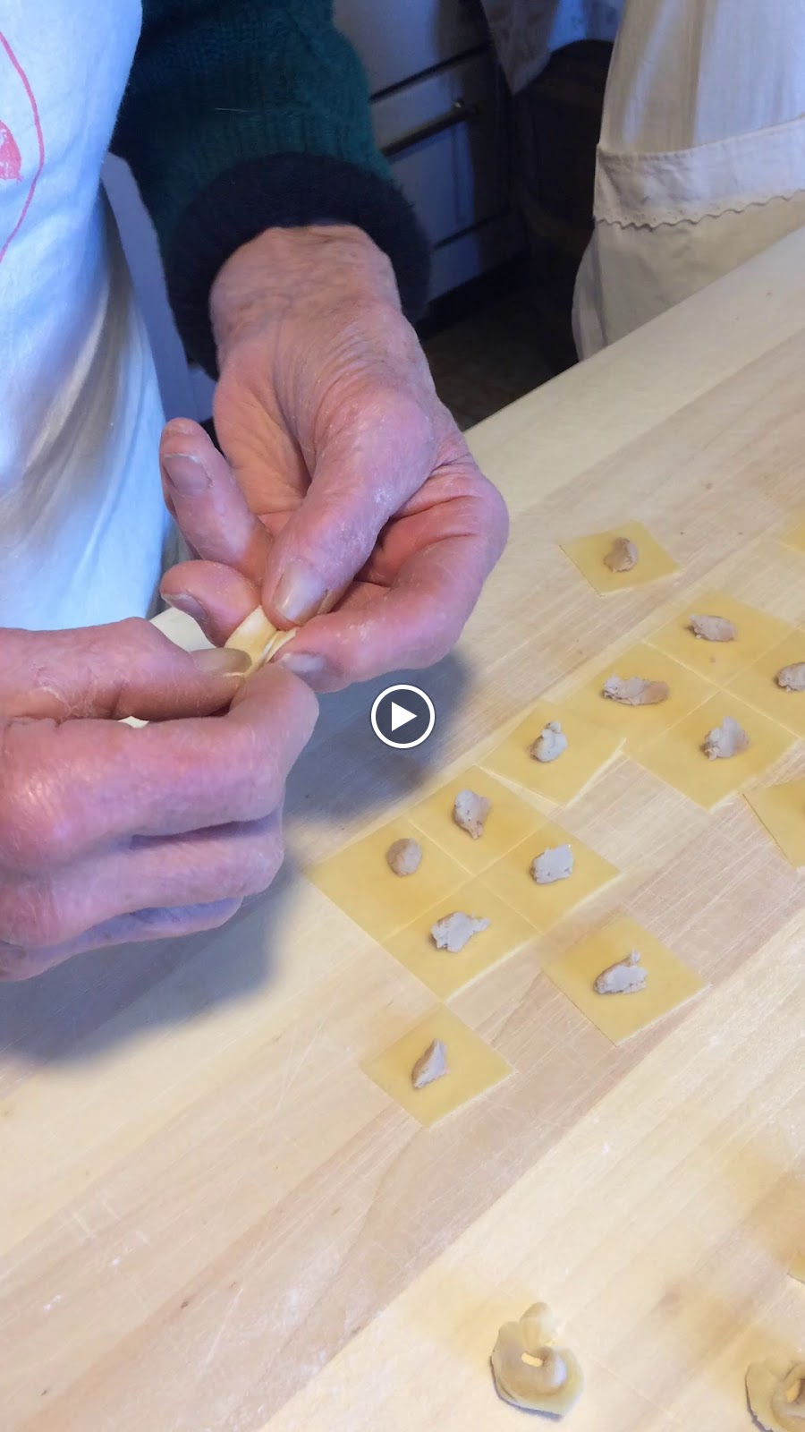 Back to my home village and to my roots, making tortellini with 92 years old Agnese and her son Antonio. Agnese has been making fresh pasta since she was a child, like all the women in these mountains, and before Christmas a number of friends and village women come over to make tortellini with her, because you don't make tortellini alone, you do it in company, as you have to work fast filling and folding and you need many tortellini (at least 30 per plate if eaten in broth, more if served with cream). So you work, and chat at the same time, and perhaps it is this conviviality that makes the women of this area live a long life.